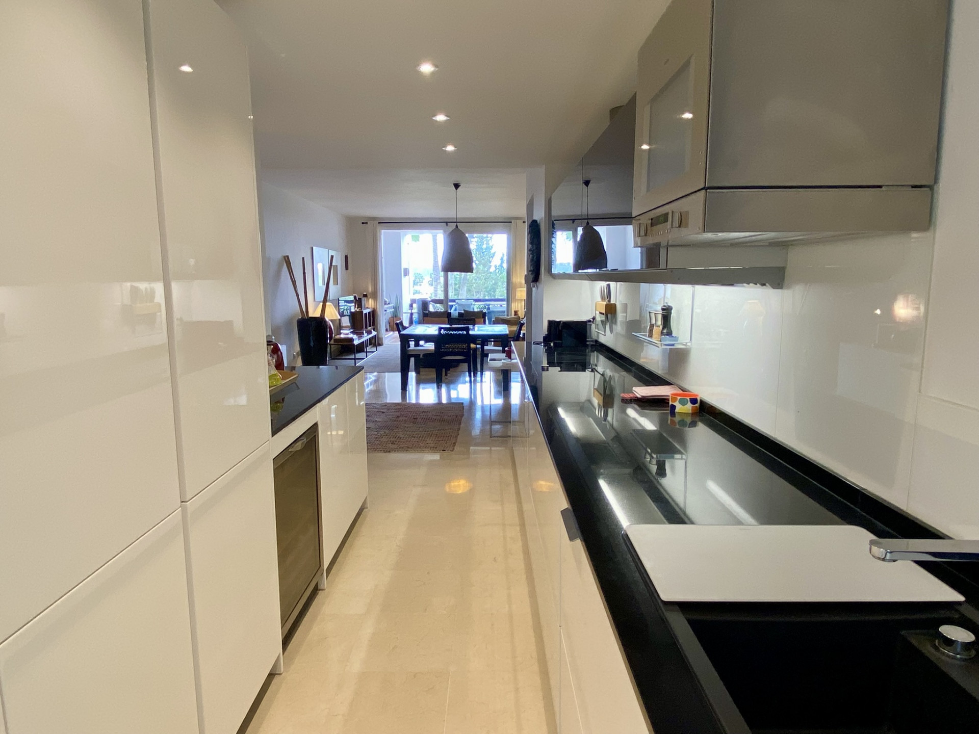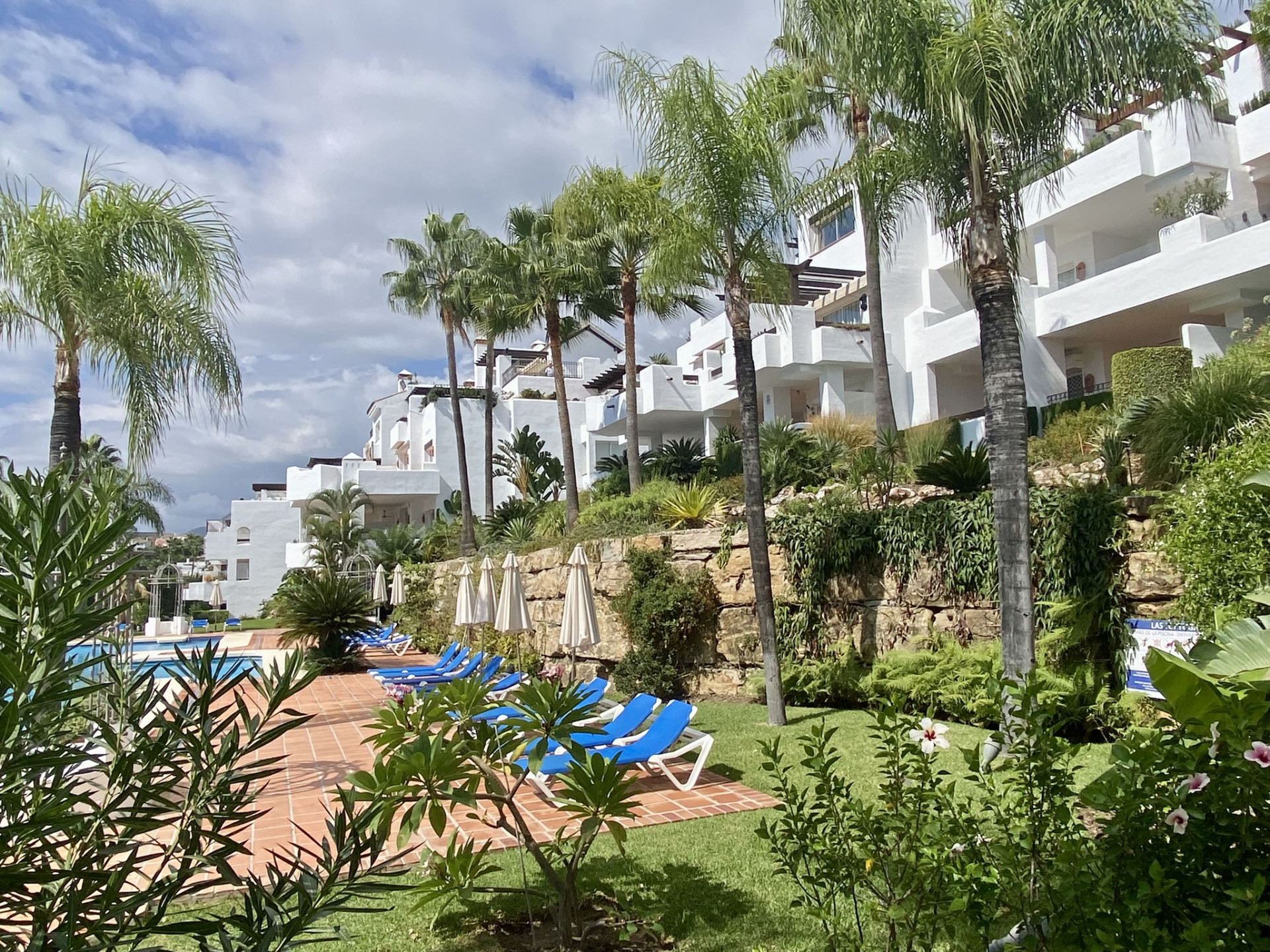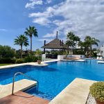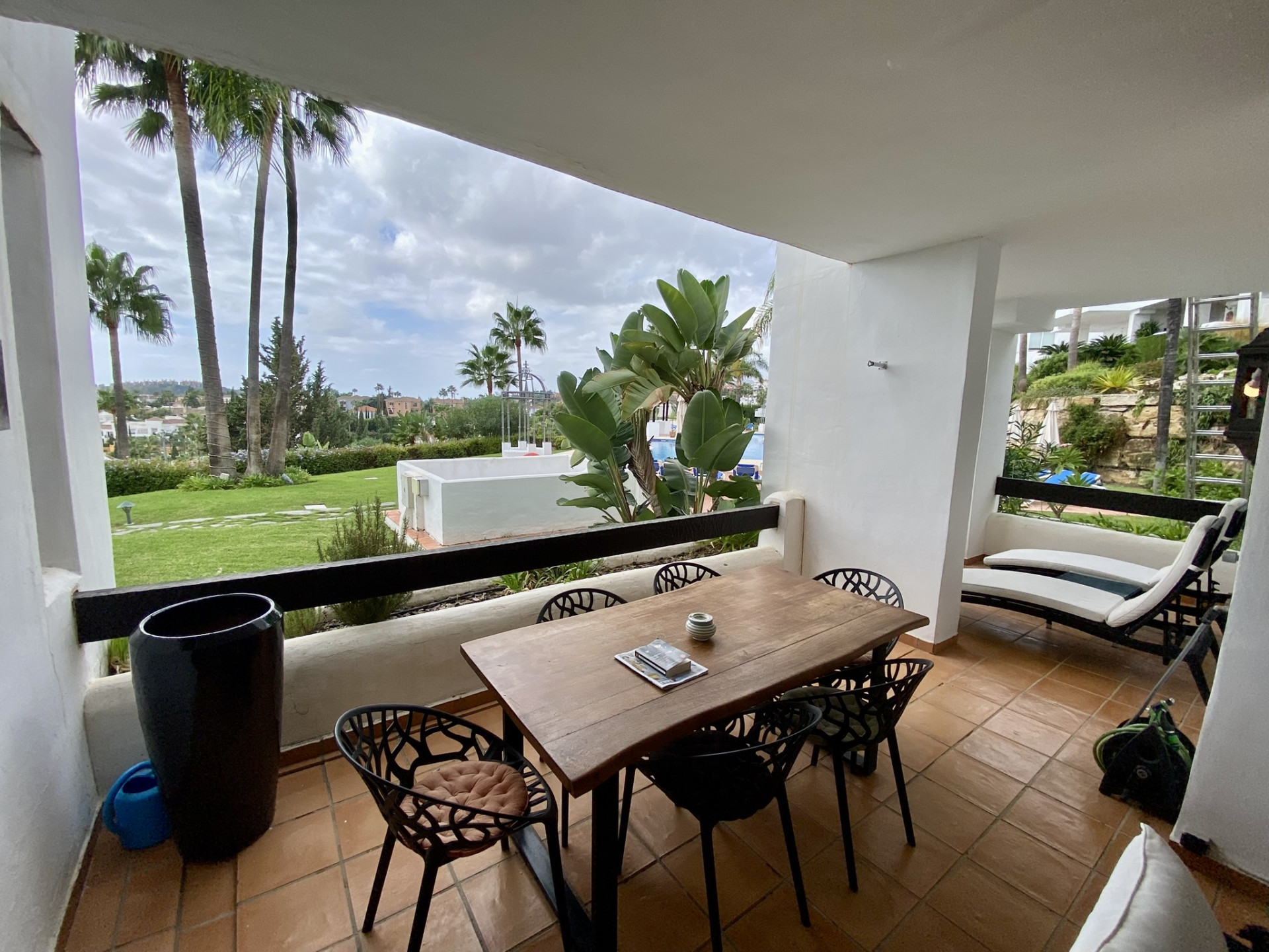 €650000 – Large two-bedroom apartment situated in the gated community of Las Tortugas located in the Golf Valley, only a short drive away from Puerto Banus and within 5 minutes’ drive of various golf courses, restaurants and supermarkets. Refurbished in 2020 with a spectacular new fully fitted Gaggenau kitchen this elevated ground floor apartment is offered in perfect condition, ready to move in. The apartment comprises of 2 bedrooms, 1 en-suite bathroom for the master bedroom with access to the covered terrace, 1 separate bathroom with a new walk-in shower, spacious living room with open plan kitchen and a big terrace with views to the garden, and the swimming pool.
